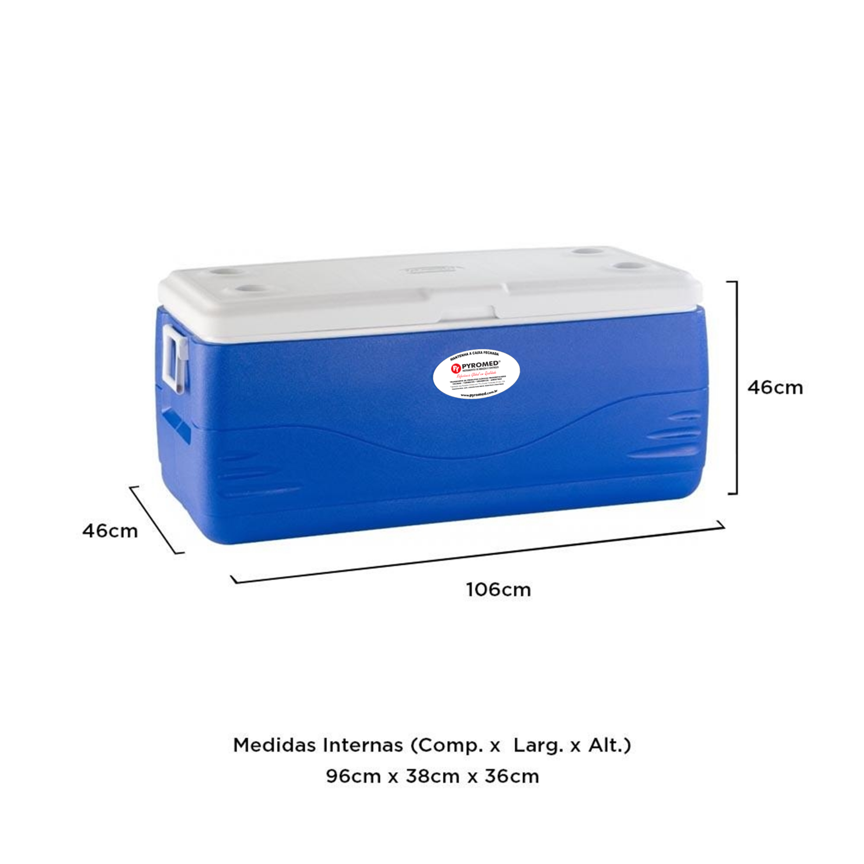 A Caixa Térmica 141,9 Litros Com Termômetro Máxima e Mínima embutido e Isolamento térmico em espuma de poliuretano da PYROMED® é a solução perfeita para o transporte seguro de medicamentos, amostras e vacinas que requerem condições de temperatura controlada.