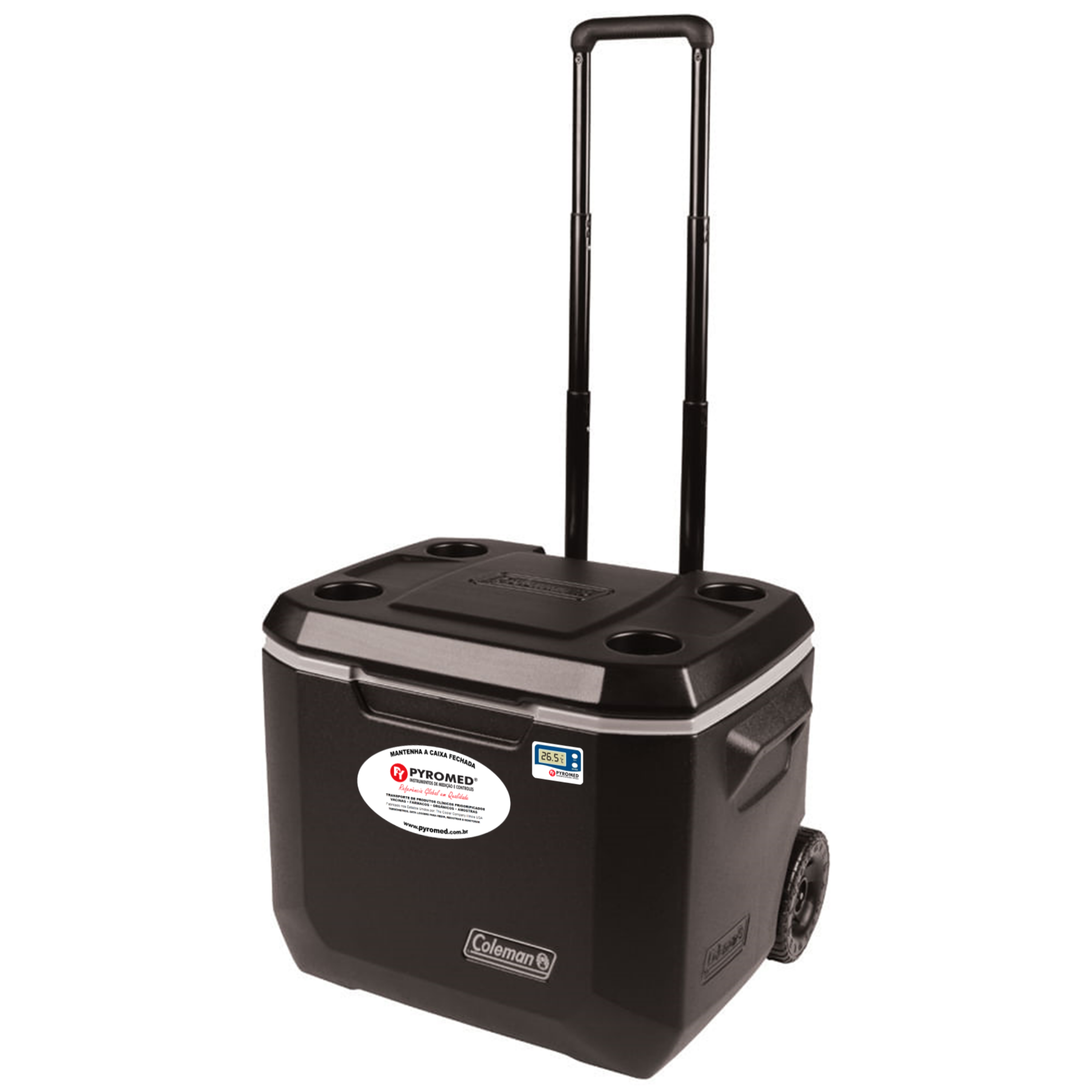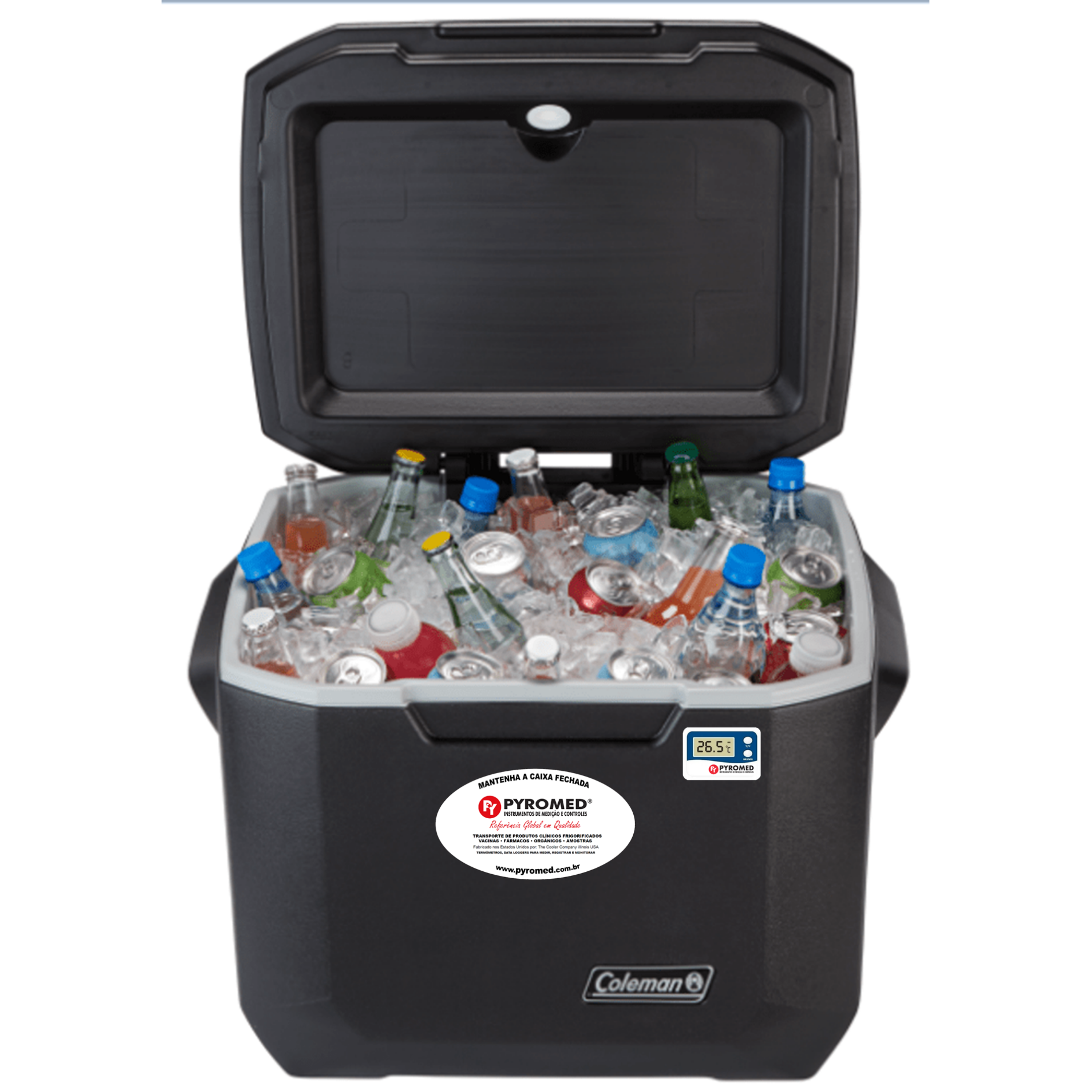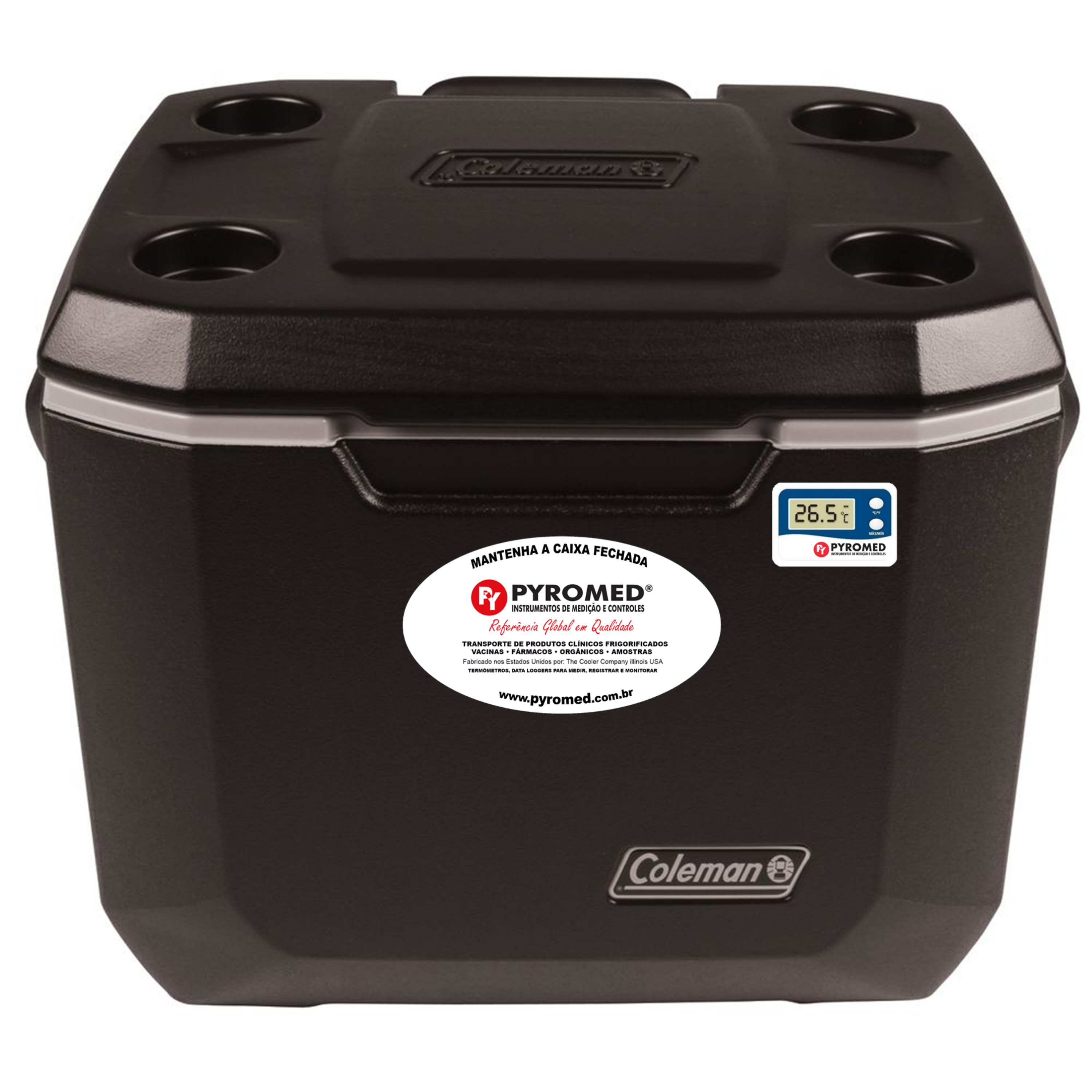 Acompanha termômetro com visor externo que mede a temperatura atual, máxima e mínima, do conteúdo interno da caixa.