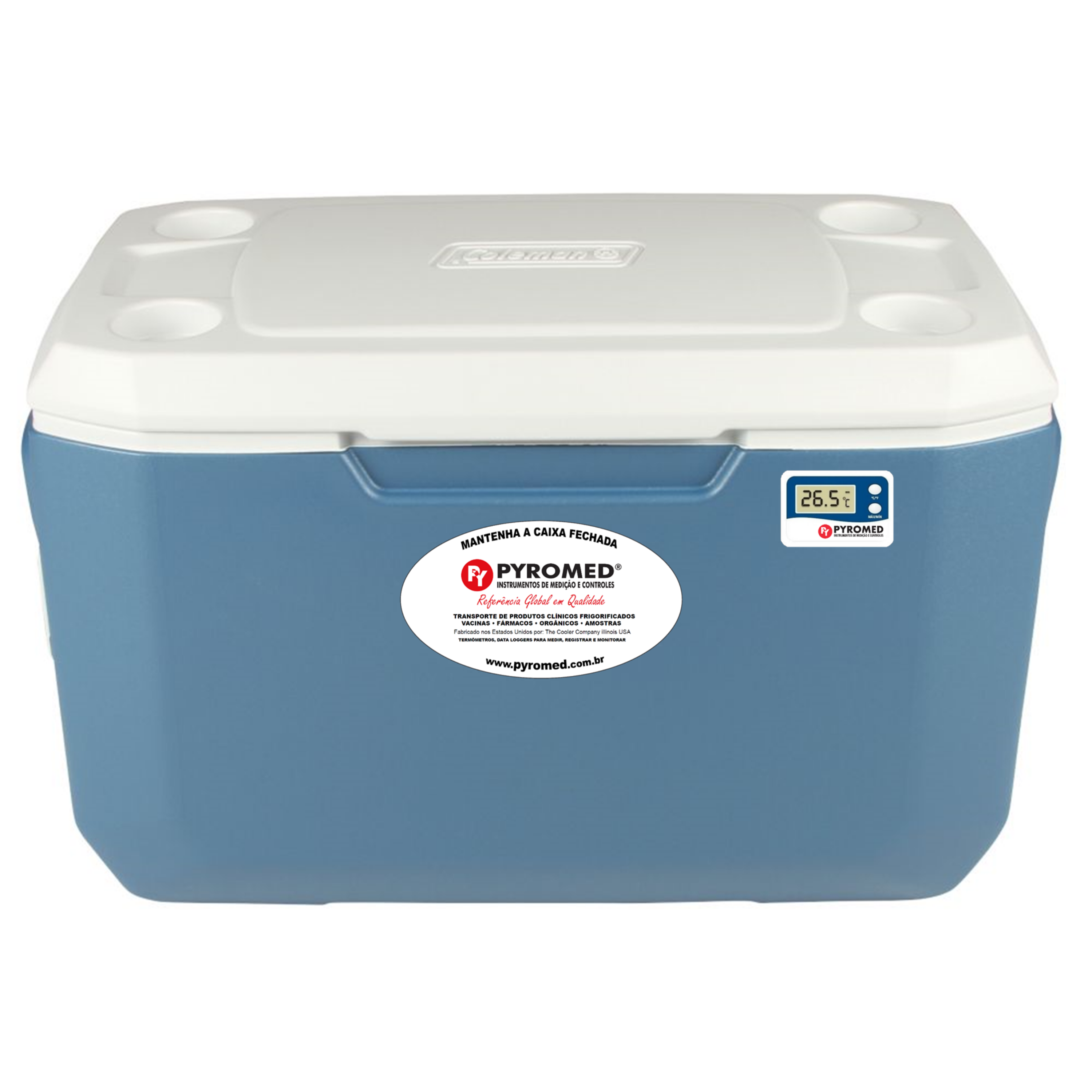 Acompanha termômetro com visor externo que mede a temperatura atual, máxima e mínima, do conteúdo interno da caixa.