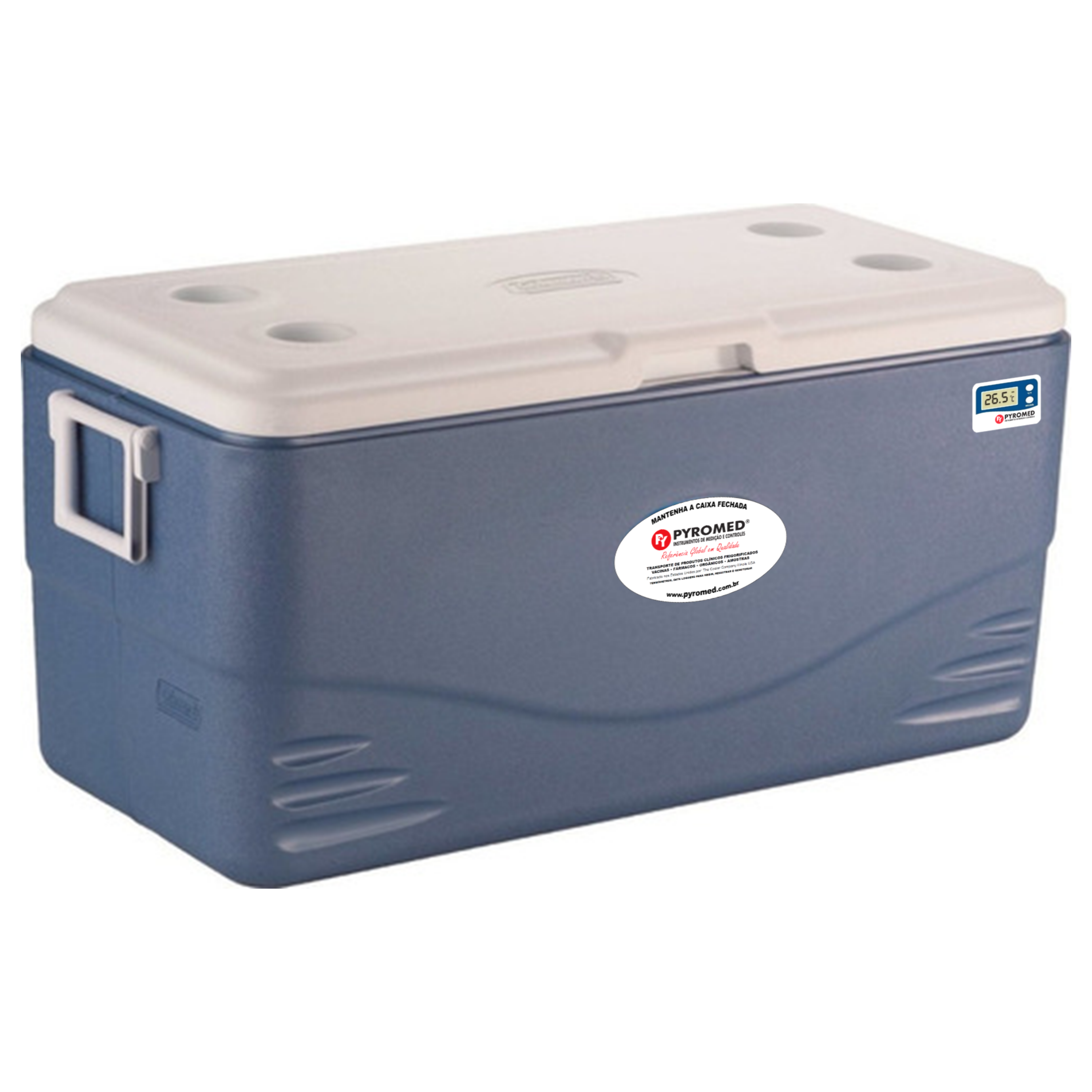 Acompanha termômetro com visor externo que mede a temperatura atual, máxima e mínima, do conteúdo interno da caixa.