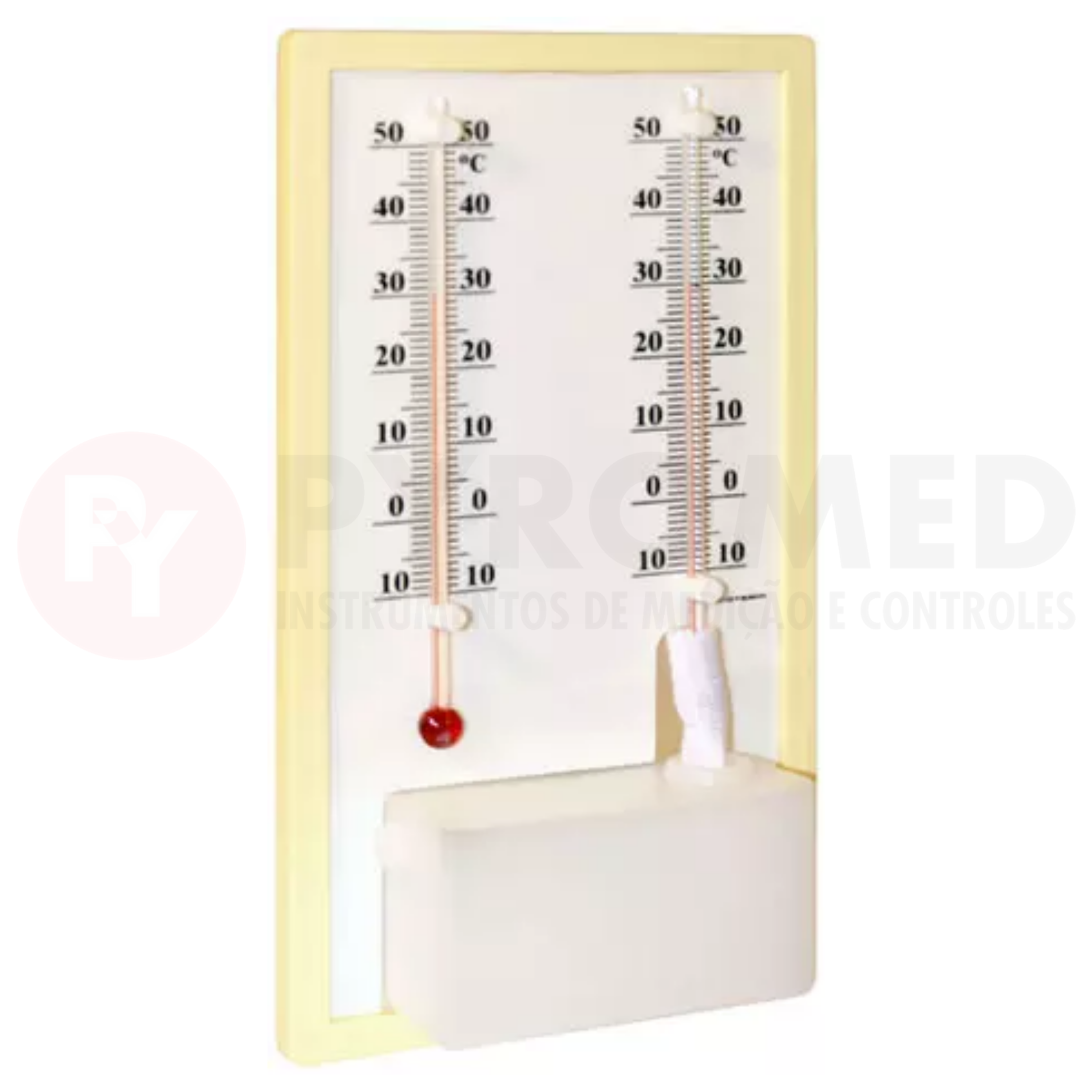 O Termo-Higrômetro Analógico Bulbo Seco e Úmido PY5195 da PYROMED® é um instrumento de medição utilizado para determinar a temperatura e a umidade relativa do ar em um ambiente. Ele consiste em dois termômetros: um com um bulbo seco e outro com um bulbo úmido. O bulbo seco mede a temperatura ambiente, enquanto o bulbo úmido mede a temperatura com umidade. A diferença entre as duas leituras permite que o aparelho calcule a umidade relativa do ar.