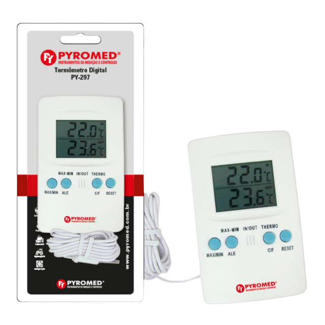 O Termo-Higrômetro Digital Umidade Interna e Temperatura Interna e Externa PY295 da PYROMED® é um dispositivo eletrônico projetado para medir a umidade e temperatura em ambientes internos e externos.