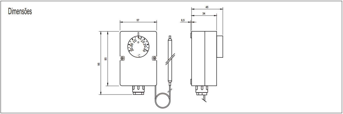Termostato regulável, a expansão de líquido, com polo duplo, com contatos comutadores. Indicado para regulagem automática da temperatura de instalações no setor de refrigeração.
